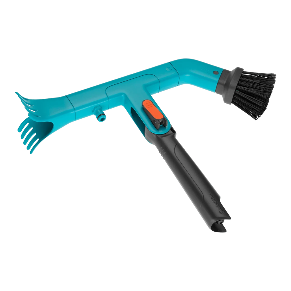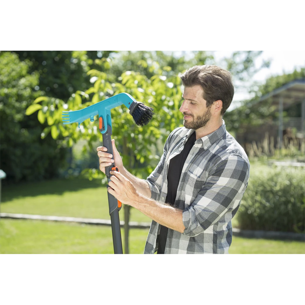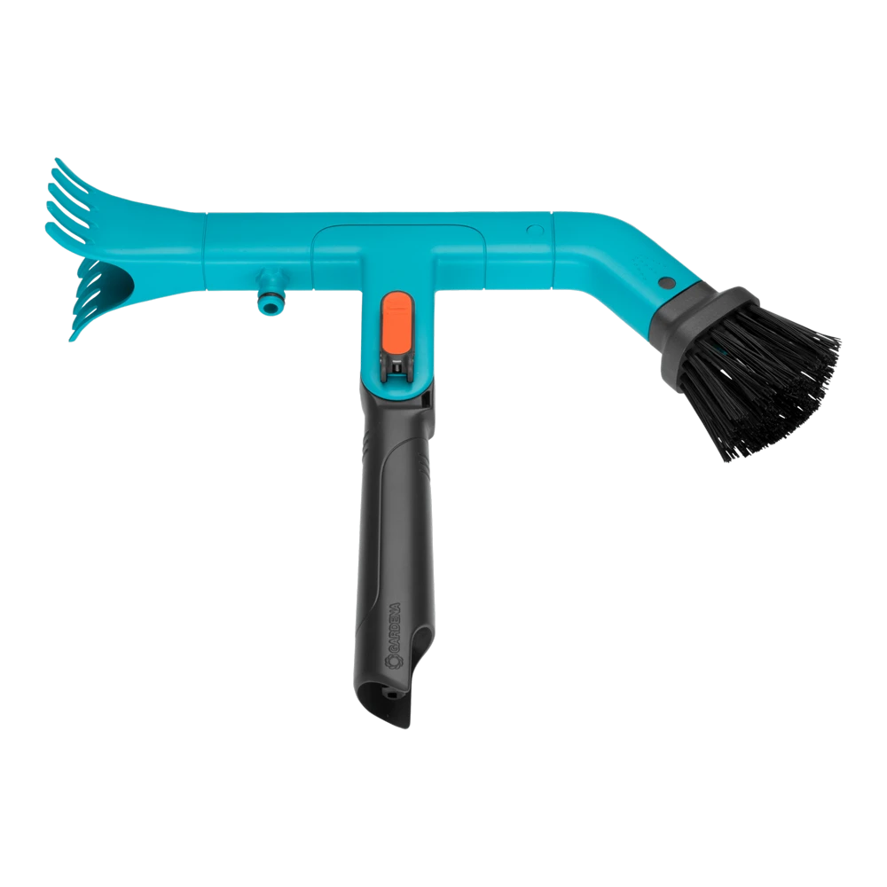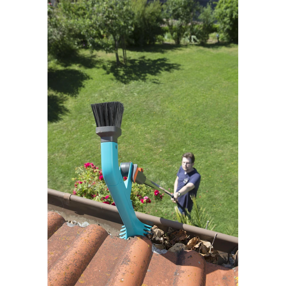 De GARDENA combisystem Gootreiniger is ideaal voor het gemakkelijk leegmaken en reinigen van dakgoten. Stevige borstels aan de ene kant en twee hoogwaardige, kunststof schrapers aan de andere kant zorgen voor efficiënte reiniging. De draaggreep maakt het mogelijk om de gootreiniger zelfs zonder steel te gebruiken. Het is ook mogelijk om water te gebruiken tijdens het reinigen. Een tuinslang kan eenvoudig worden aangesloten dankzij de Original GARDENA System aansluiting. De werkhoek is eenvoudig instelbaar met een quick-lock hendel. De gootreiniger past op alle GARDENA combisystem stelen, waarbij GARDENA een telescopische steel adviseert om tot ca. 5 meter hoog te kunnen werken.