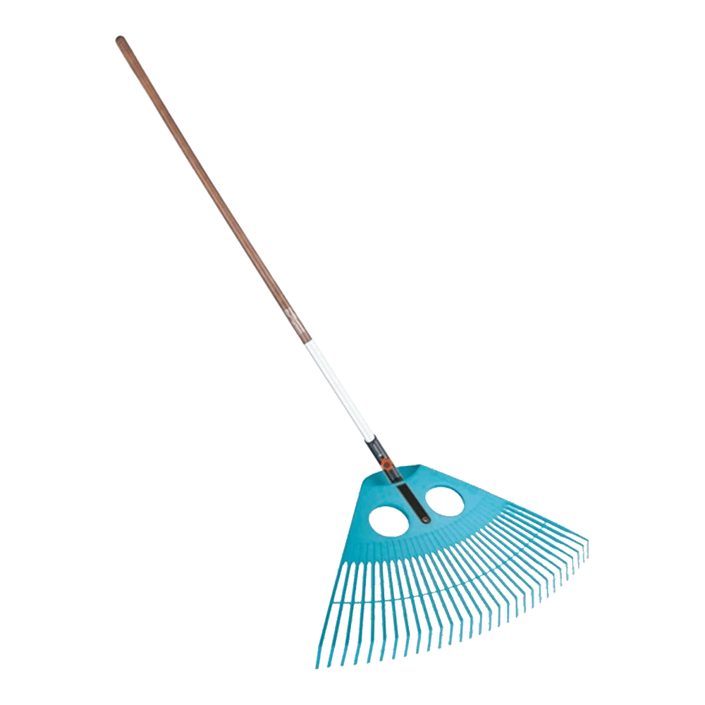 Voor het snel bijeenharken van bladeren, gemaaid gras en ander tuinafval over grote oppervlakken. Hoogwaardige kunststof. Werkbreedte 77 cm. Compleet met houten handvat FSC 130 cm. 25 jaar garantie.
