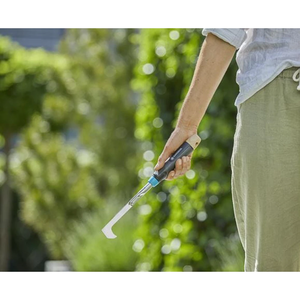 Moeiteloos en duurzaam – voegen in de oprijlaan of het terras worden snel en gemakkelijk onkruidvrij gemaakt dankzij de Ecoline Onkruidsteker voor de Patio van GARDENA. De onkruidsteker voor de patio is ideaal voor het verwijderen van mos en onkruid uit nauwe voegen in de oprijlaan, ruimtes tussen natuursteen, randen langs muren of de bestrating rondom het huis. Binnen de kortste keren is het overal netjes en onkruidvrij. De gebruikte kunststof bestaat voor meer dan 85 procent uit gerecycled materiaal, voornamelijk afkomstig van huishoudelijk afval. Het roestvrijstalen blad van het gereedschap is aan beide zijden geslepen en vervaardigd met meer dan 45 procent gerecycled materiaal. Onkruid en mos kunnen nauwkeurig uit alle voegen en spleten worden verwijderd. De greep van de onkruidsteker voor de patio heeft een met was behandeld FSC® 100% gecertificeerd houten uiteinde waardoor uw nieuwe tuingereedschap een stijlvolle en natuurlijke uitstraling heeft. Het materiaal is niet alleen duurzaam, het maakt uw onkruidsteker ook sterk en robuust. Dankzij de ergonomisch gevormde handgreep wordt het onkruid wieden heel comfortabel. De EcoLine Onkruidsteker wordt in Europa vervaardigd en door GARDENA ondersteund met een fabrieksgarantie van 25 jaar. Een natuurlijke keuze voor tuiniers met passie. ReTh!nk – De nieuwe EcoLine serie. Verantwoord geproduceerd. Esthetisch ontworpen. Duurzaam vervaardigd.