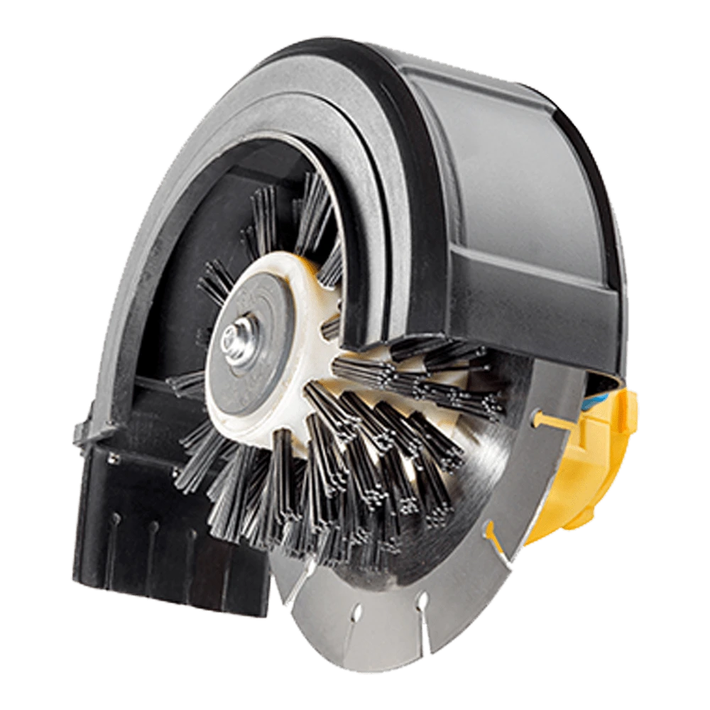Een 1 mm dunne roestvrijstalen schijf met sleuven snijdt in de grond, grijpt de grassprietjes en snijdt ze door. Tegelijkertijd verwijdert de 50 mm brede nylon borstelrol mos en vuil van de steenrand.