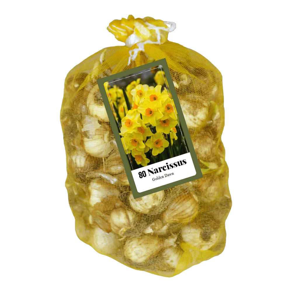 Een netlon verpakking met 80 Narcissen Golden Dawn; incl. fotolabel met plantinstructies.