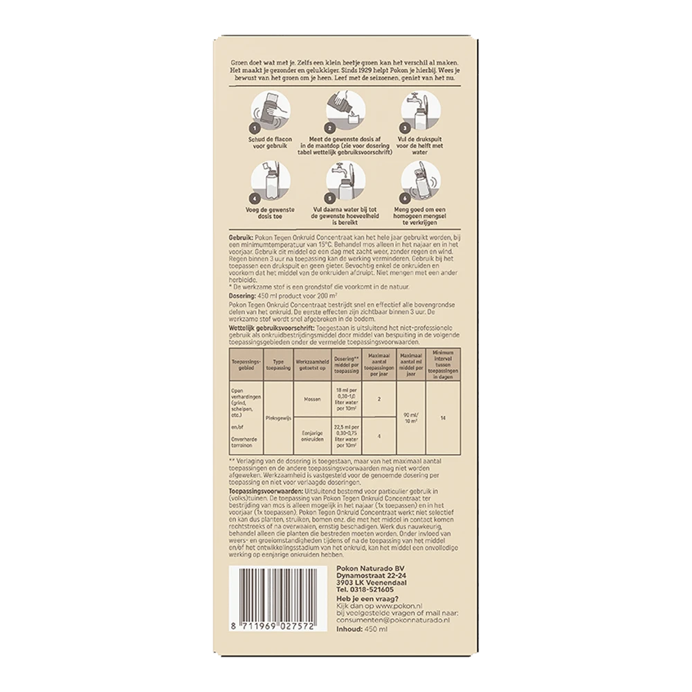 Pokon Tegen Onkruid Concentraat bestrijdt snel en effectief alle bovengrondse delen van het onkruid. De eerste effecten zijn zichtbaar binnen 3 uur. De werkzame stof wordt snel afgebroken in de bodem. Pokon Tegen Onkruid Concentraat kan het hele jaar gebruikt worden, bij een minimumtemperatuur van 15 graden Celsius. Behandel mos alleen in het najaar en in het voorjaar. Gebruik dit middel op een dag met zacht weer, zonder regen en wind. Regen binnen 3 uur na toepassing kan de werking verminderen. Gebruik bij het toepassen een drukspuit en geen gieter. Bevochtig enkel de onkruiden en voorkom dat het middel van de onkruiden afdruipt. Niet mengen met een ander herbicide.