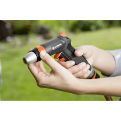 De robuuste GARDENA Premium Reinigingssproeier is geschikt voor zowel reiniging als bewatering. De nevel kan variabel worden ingesteld van volle straal tot een fijne nevel. De spuitkop en de connector zijn van metaal en daardoor erg duurzaam. De ergonomische handgreep met zachte kunststof componenten zorgt voor optimaal bedieningscomfort tijdens het gebruik. De waterstroom kan traploos worden ingesteld. Voor continu gebruik kan de impulshendel worden vastgezet. De Premium Reinigingssproeier beschikt bovendien over geïntegreerde bescherming tegen vorst.