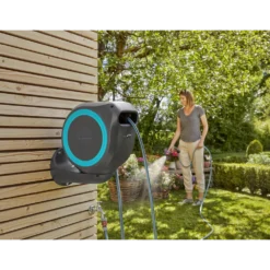 Tuinieren is handiger en gemakkelijker dan ooit met de wandslangenbox RollUp S. Deze helpt uw tuin netjes en opgeruimd te houden en voorkomt hinderlijk struikelgevaar als gevolg van een rondslingerende slang. De praktische slangopslag is eenvoudig aan de muur van uw huis te bevestigen en wordt met een flexibele aansluitslang aangesloten op de kraan. Dankzij de stevige muurbeugel kan de slangenbox meer dan 180 graden worden gedraaid, zodat u elke hoek van uw tuin moeiteloos kunt bereiken. Voor direct gebruik kunt u de tuinslang eenvoudig verlengen tot een lengte van maximaal 15 meter. De tuinslang wordt automatisch in heel korte intervallen vergrendeld zodra u stopt, wat betekent dat de slang eenvoudig en gemakkelijk te hanteren is. Door lichtjes aan het uiteinde van de slang te trekken, wordt de vergrendeling ontgrendeld en een ingebouwde stalen veer met innovatieve RollControl-technologie zorgt voor soepel en gecontroleerd oprollen. De RollControl beschermt de slangenbox en de omgeving tegen schade als gevolg van het te snel inrollen. Om knikken of knopen in de slang te voorkomen, heeft de box een geïntegreerde slanggeleider. Dankzij de slang- en kraanaansluitingen van het Original GARDENA System kunt u eenvoudig en flexibel een verlengstuk of ander compatibel GARDENA element op de slang aansluiten. U hebt altijd uw GARDENA slangopzetstukken bij de hand. Ze kunnen onder de muurbeugel worden bevestigd en daar worden opgeborgen om ruimte te besparen. De GARDENA wandslangenbox is UV- en vorstbestendig en kan het hele jaar door probleemloos aan de muur van het huis blijven bevestigd. Het hoogwaardige materiaal biedt u een lange levensduur en gebruiksgemak zonder onderhoud. Bovendien kan de box niet worden gestolen dankzij de antidiefstalbeveiliging en kan de box alleen door u van de muur worden verwijderd. Samen met de wandslangenbox ontvangt u een muurbeugel, een flexibele aansluitslang, alle benodigde Original GARDENA System en montageonderdelen en een mondstuk met twee verschillende sproeiopties. Bewatering die altijd gebruiksklaar is , dankzij de GARDENA wandslangenbox RollUp S.